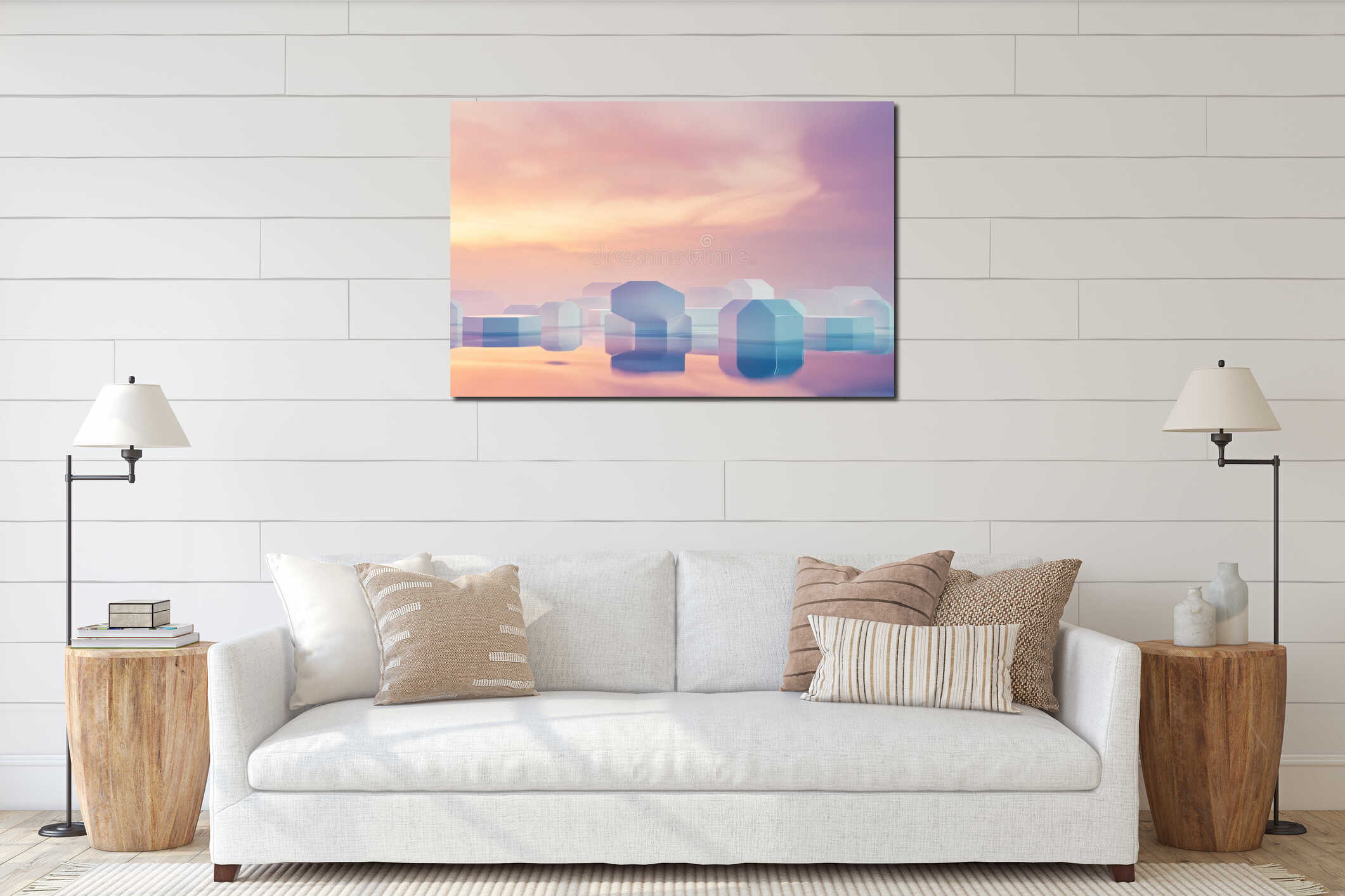 A sleek minimalist 3D background with translucent hexagons floating in a gradient pastel sky. The Canvas Print