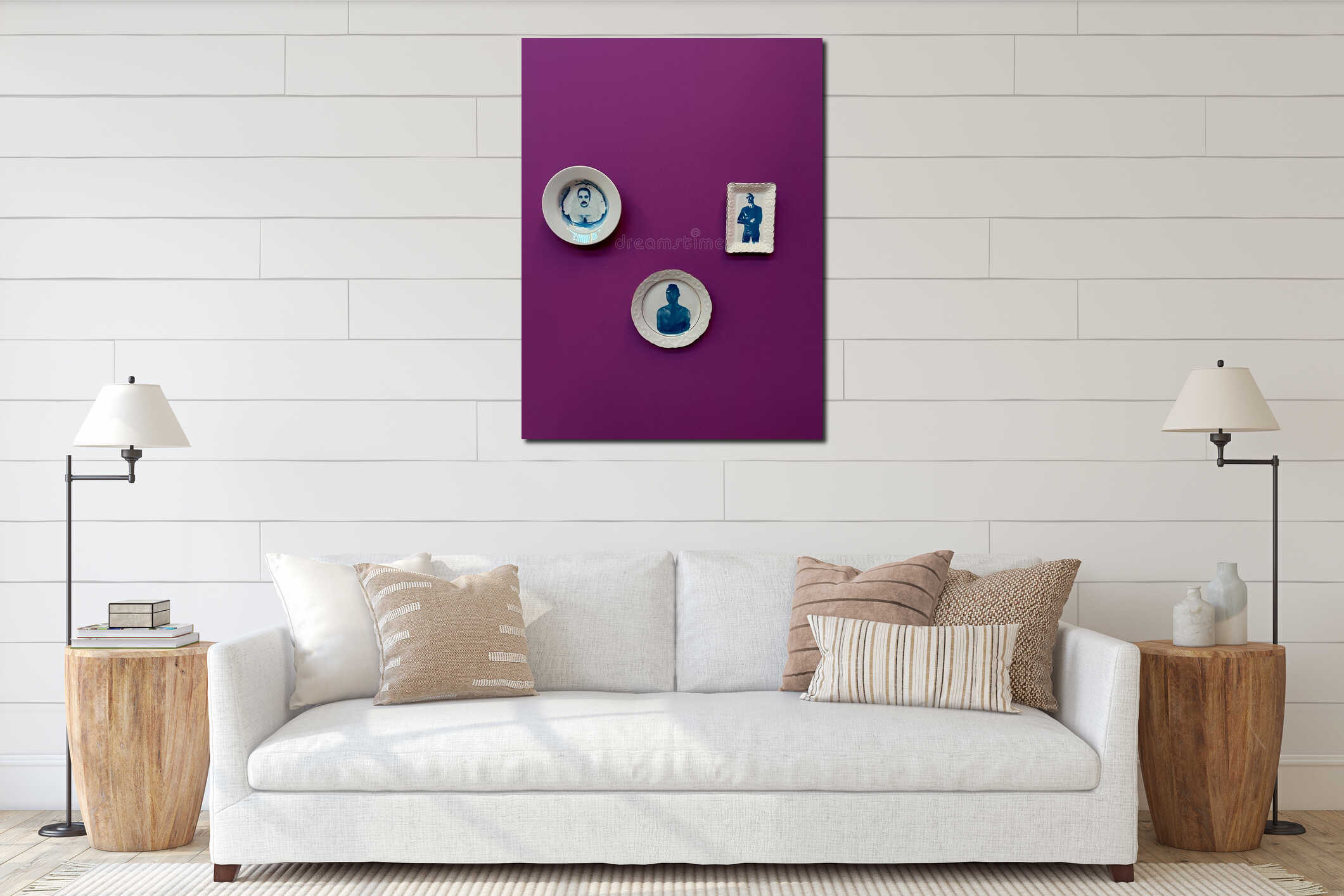 Three porcelain plates with monochrome blue male portraits are mounted on a solid purple wall, shown in an art exhibition setting. Canvas Print