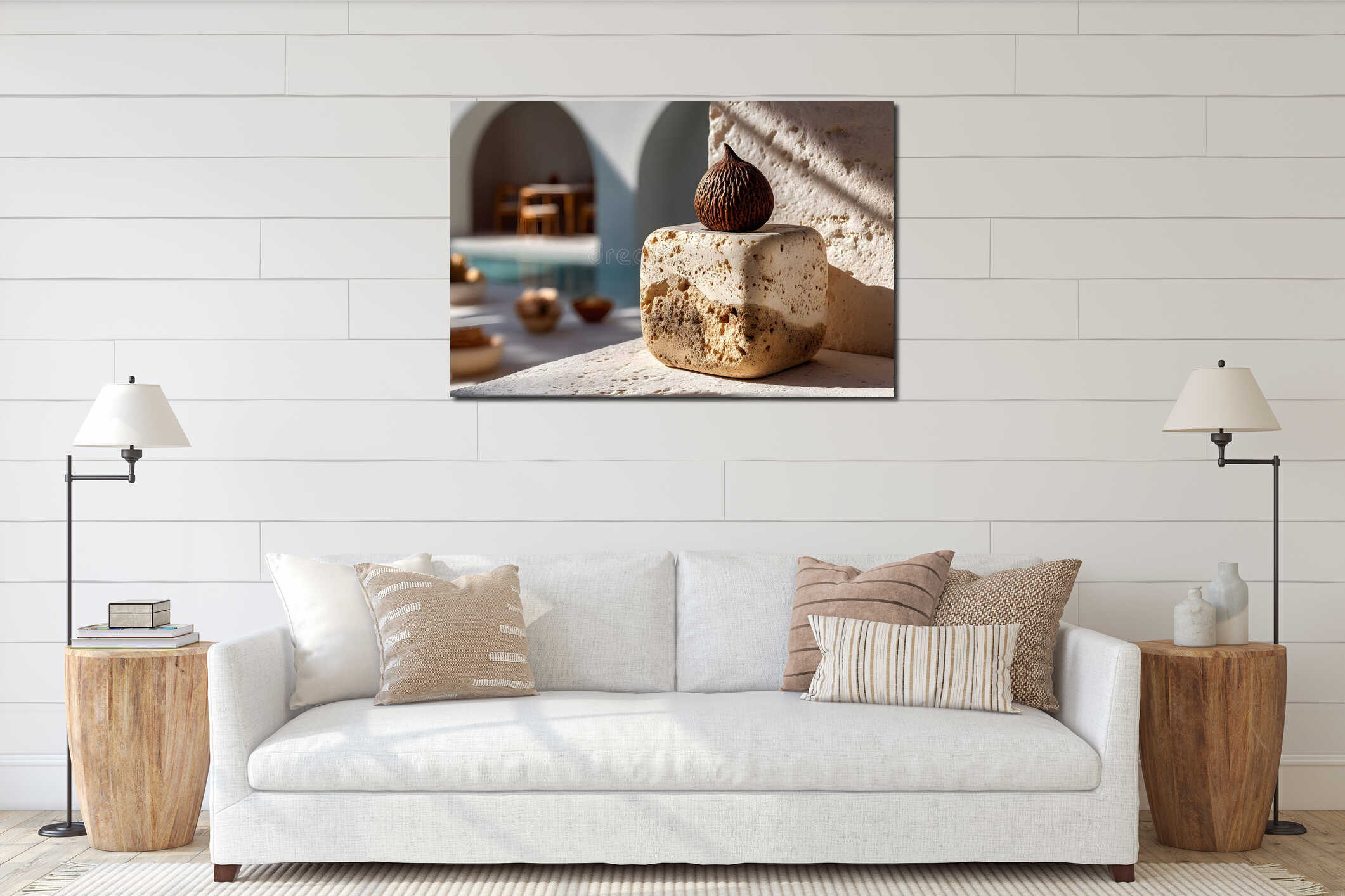 Mediterranean Tranquility: Rustic Interior with Natural Elements and Sculptural Art Generative AI Canvas Print
