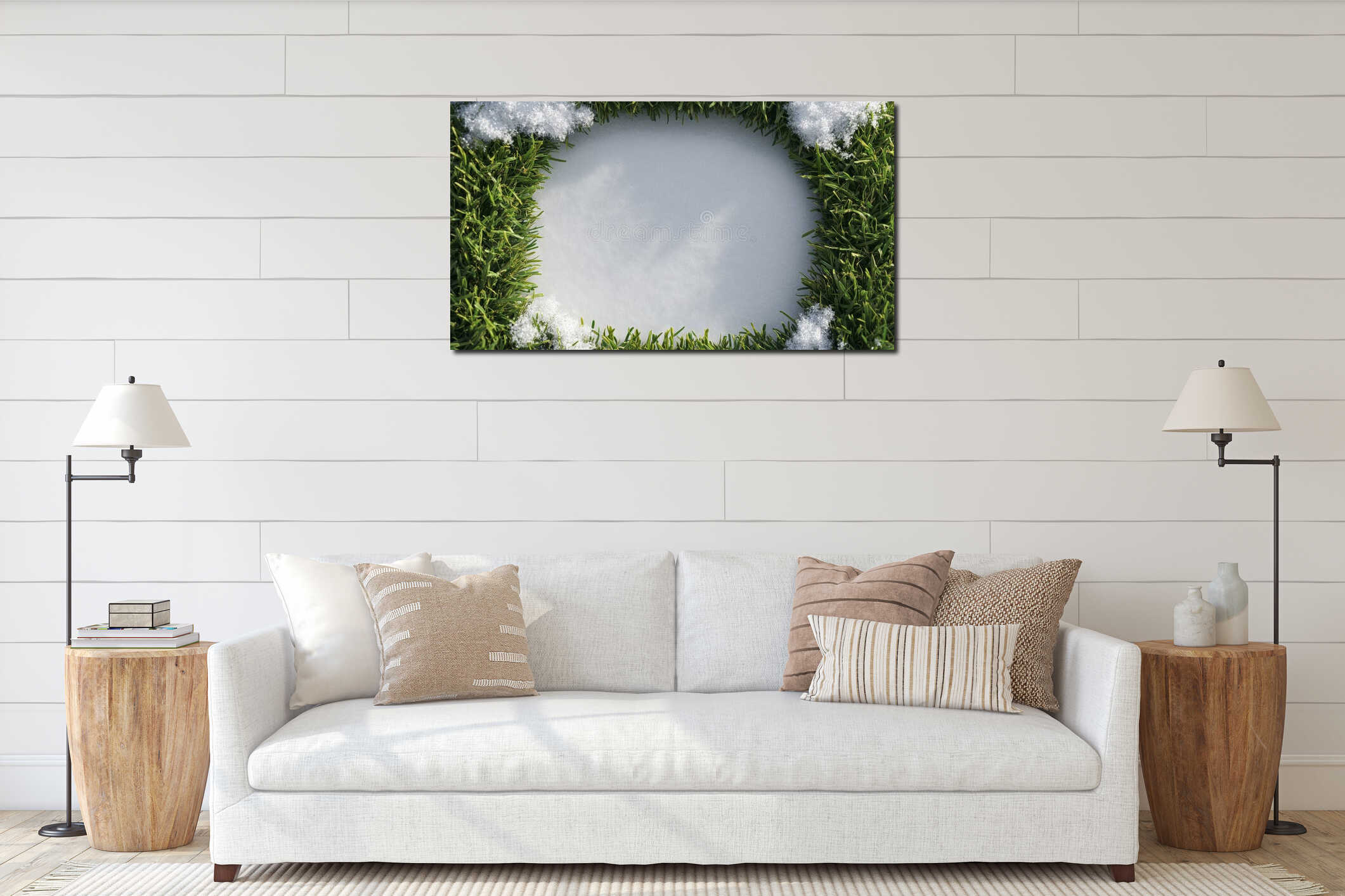 Minimalist nature background with vivid green grass piercing through melting snow Canvas Print