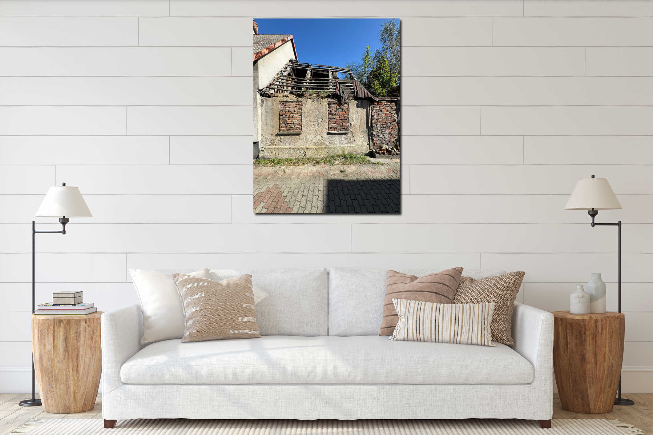 Abandoned ruined house wall with broken roof urban decay Canvas Print
