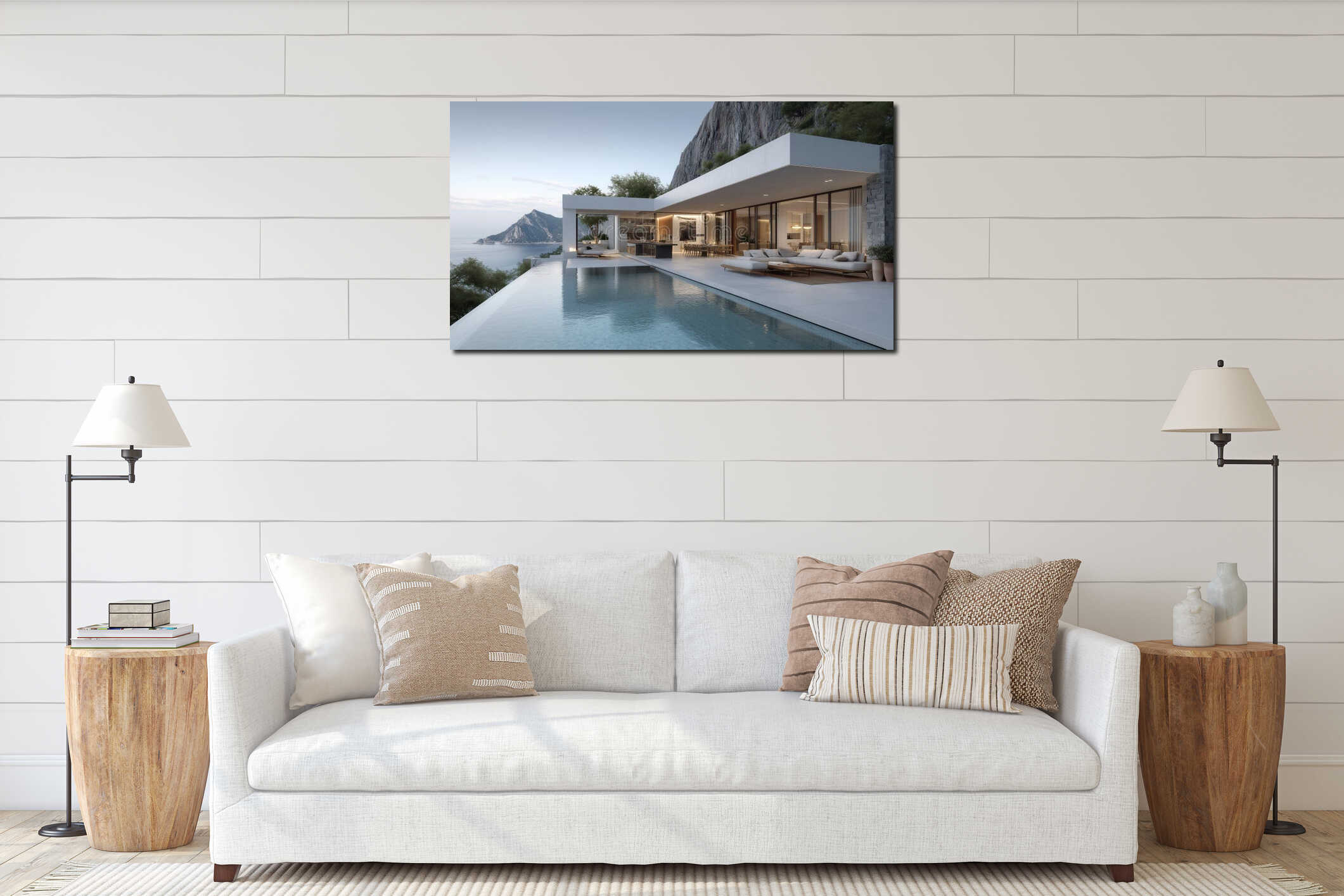 Modern, sleek, minimalist house exterior. Stylish luxury home with pool, patio, and glass facade. Contemporary design for an Canvas Print