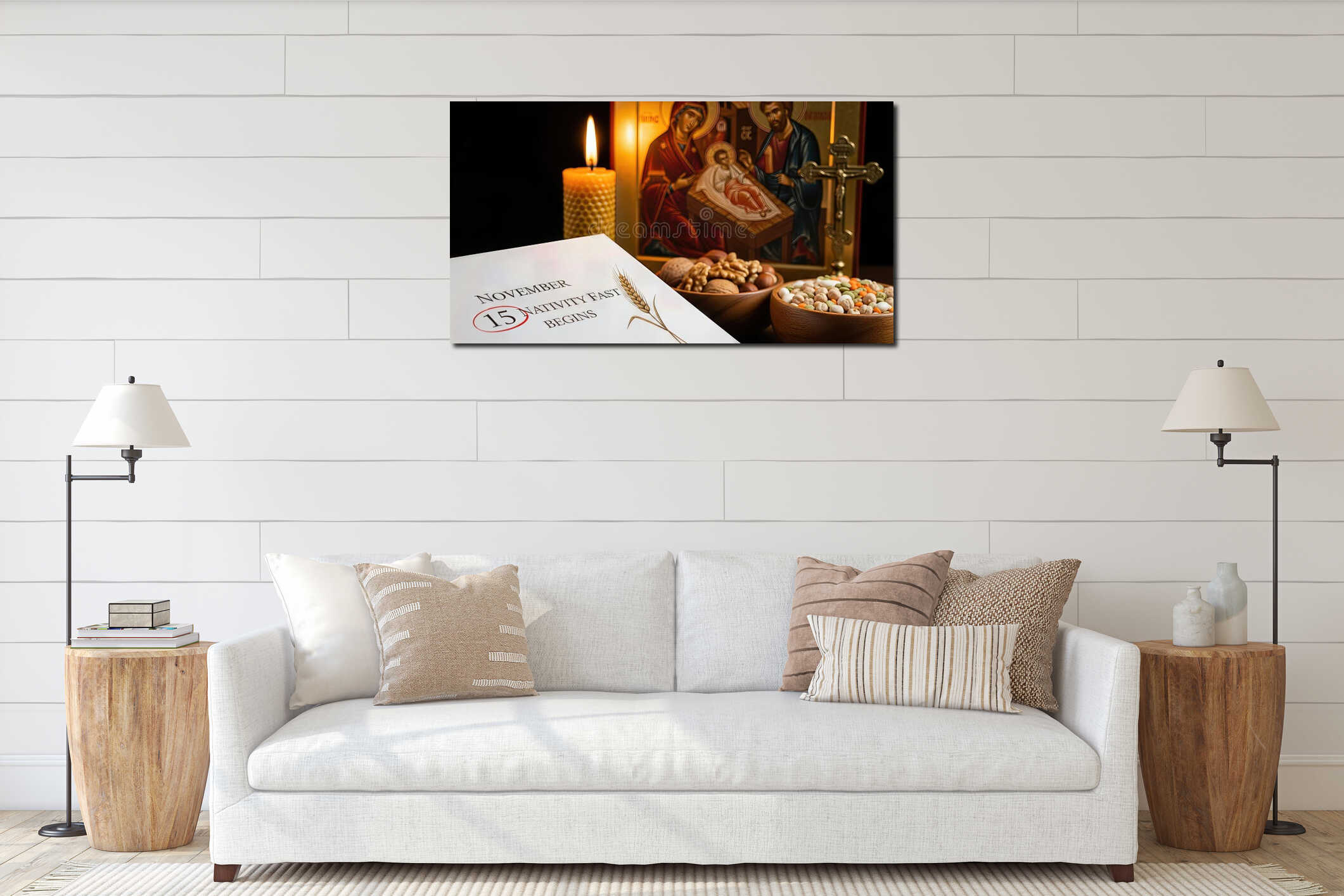 Religious symbols, a lit candle, and bowls of nuts and grains signify the start of a spiritual fasting period in Canvas Print