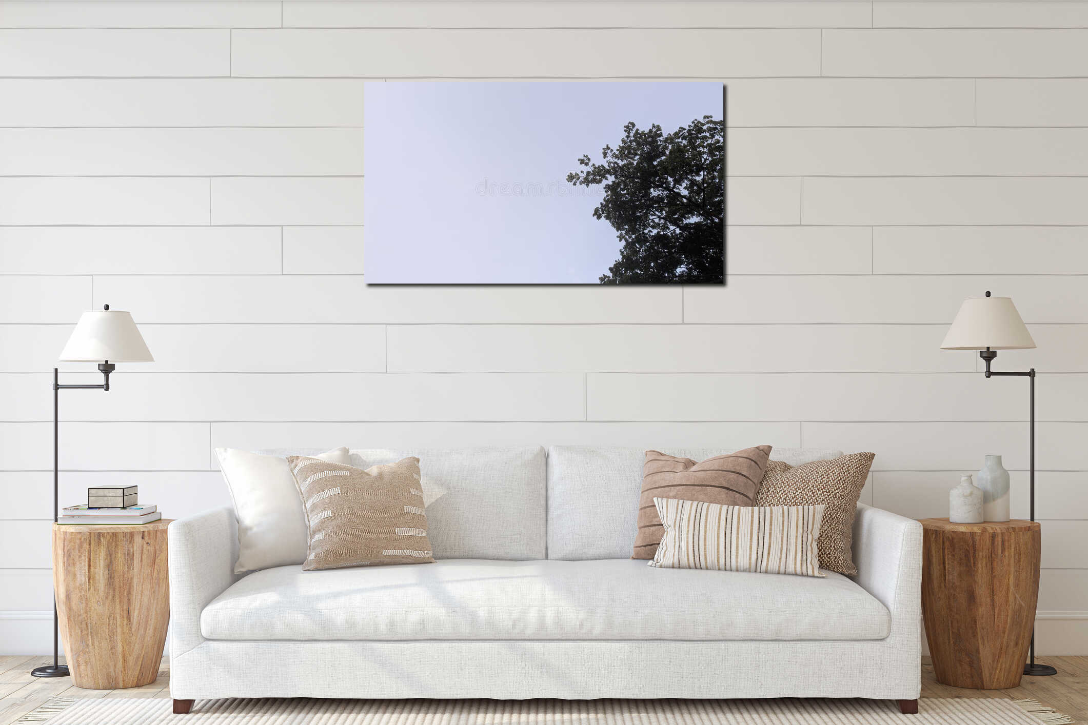 Minimalist nature image featuring a bright, hazy sky with dark tree foliage dominating the right side. Excellent copy Canvas Print